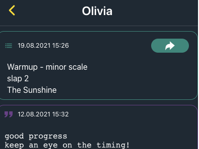 Quickly get an overview of what you worked on recently with each student. See the past exercises as well some comments and notes you wrote yourself.